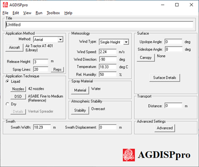 AGDISPpro is a proprietary product of Mount Rose Scientific, LLC and includes a developing model for orchard airblast sprayers and an interface to UAV flow fields. Mount Rose Scientific, LLC acquired all rights to AGDISPpro from Continuum Dynamics, Inc.