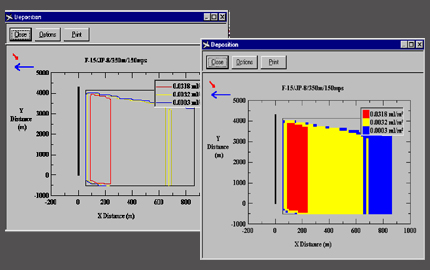 The model features numerous input/output elements and displays. A main screen (Figure 2) contains nearly all U.S. Air Force aircraft, and other aircraft can be easily added. Plots of surface deposition are available and provide the approximate location, areal extent, and concentrations of material reaching the ground (Figure 3). Separate plots of drop size distribution and time aloft are also provided, as is surface evaporation (a result which answers “How long will the fuel remain on the surface”).